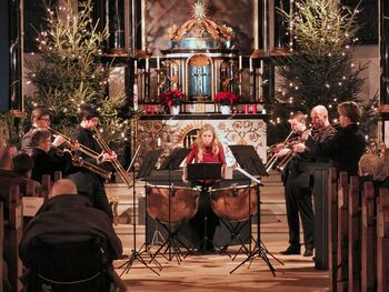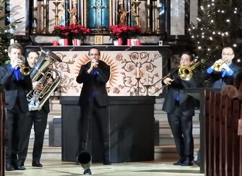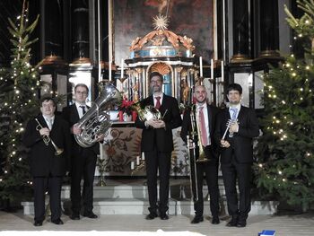 Fünf Blechbläser spielen festlich-strahlende Weihnachtsmusik